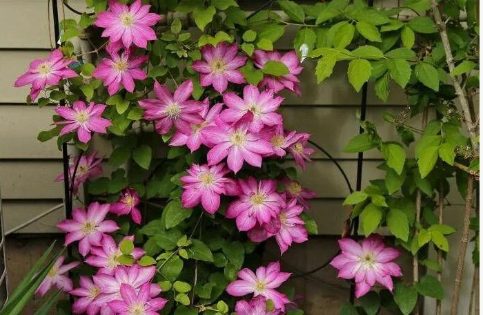 С мая по июль растение буквально покрывается огромными бутонами диаметром 14–18 см: шесть-восемь лепестков нежного пастельно-розового оттенка подчёркнуты аккуратной белой штрих-полосой вдоль каждой пластины. Контраст усиливают ярко-жёлтые тычинки, придавая композиции свежесть и динамику. Нежная гамма особенно выразительна на тёмных изгородях, кирпичных стенах или хвойных соседях.